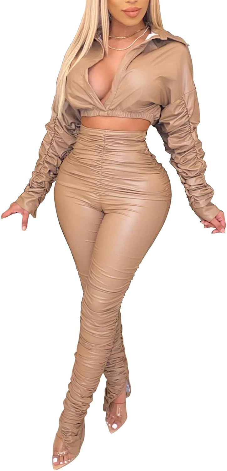 Women's PU Faux Leather Ruched 2 Piece Outfits
