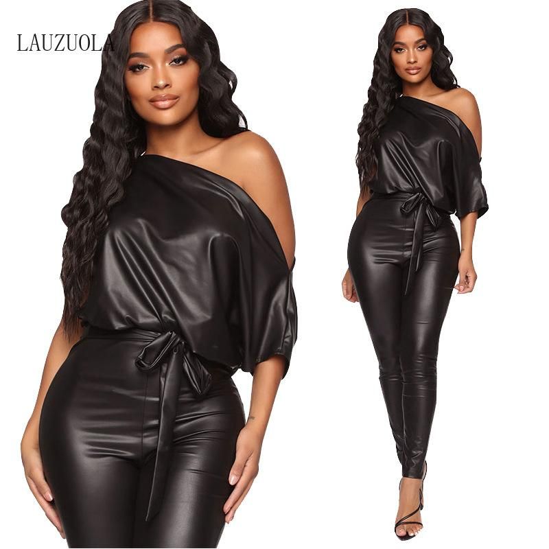 2020 Black Faux Leather Jumpsuit Womens Long Pants Short